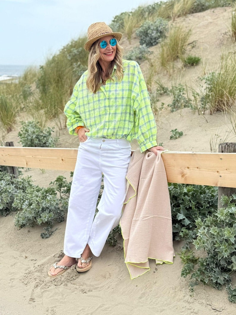 Mach dein Outfit zum Hingucker mit dem Salt & Sand Musselintuch in Beige mit Neon Gelb!