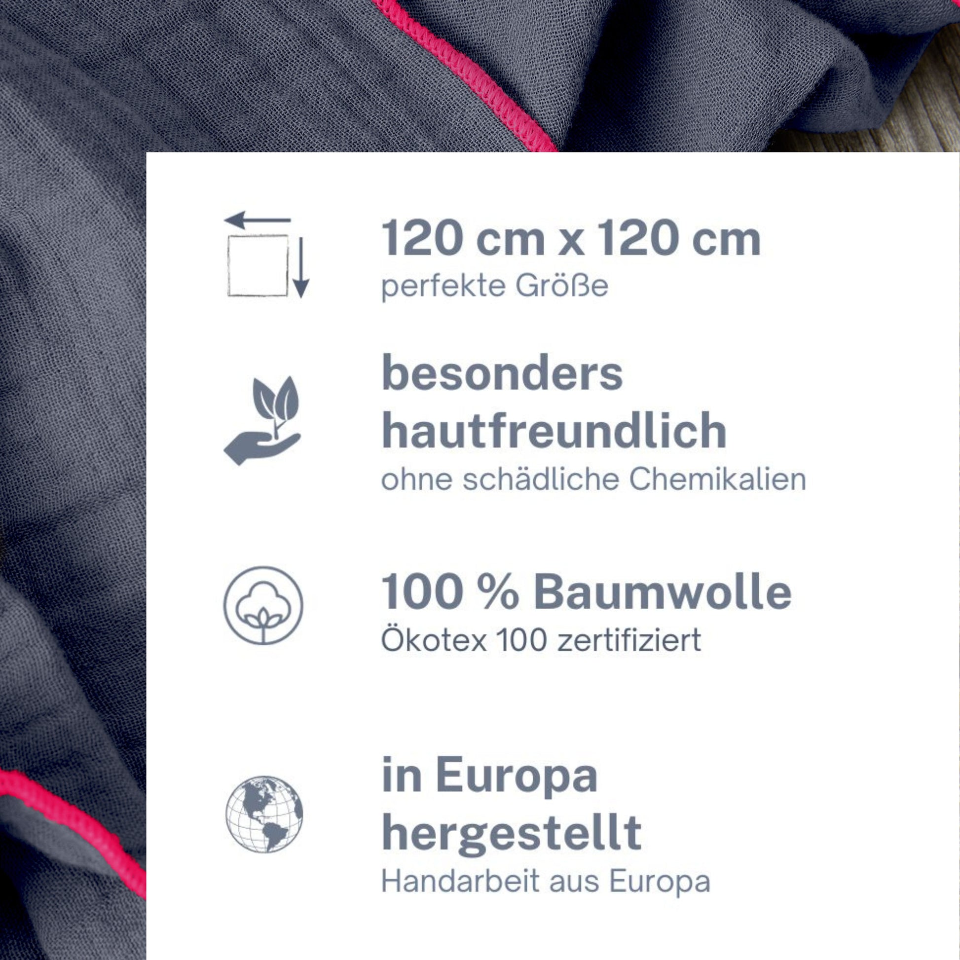 Dank der atmungsaktiven und temperaturausgleichenden Eigenschaft des Musselinstoffes sind unsere Tücher jahreszeitenunabhängige Allroundtalente!