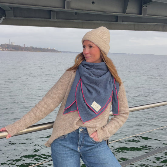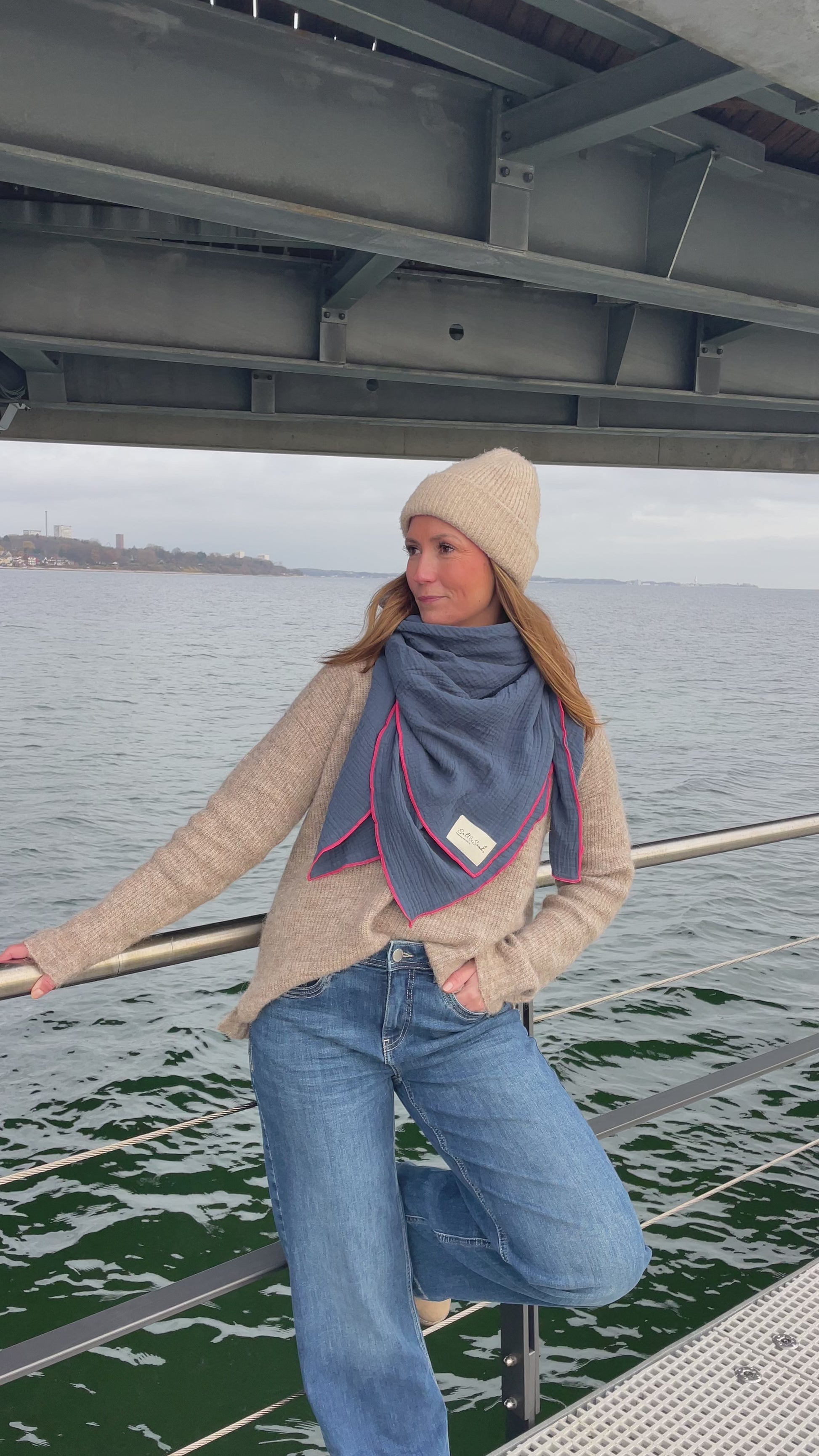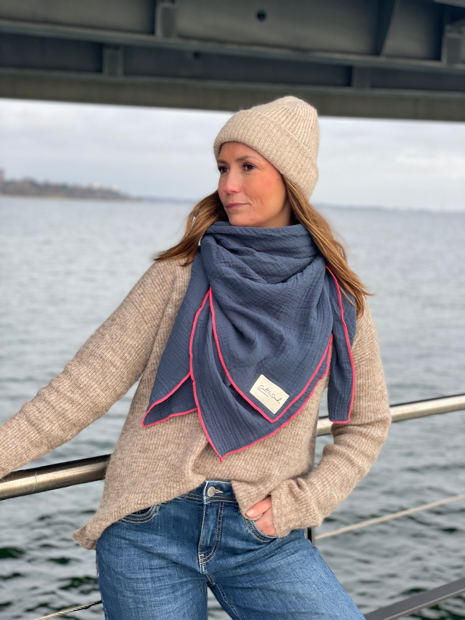 Mach dein Outfit zum Hingucker mit dem Salt & Sand Musselintuch in Jeansblau mit pink!